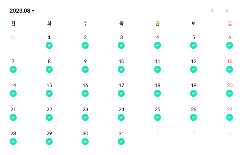 나는 4개월 동안 매일 학습을 했는데, 도장이 모두 찍힌 캘린더를 보면 굉장히 뿌듯한 마음이 든다.