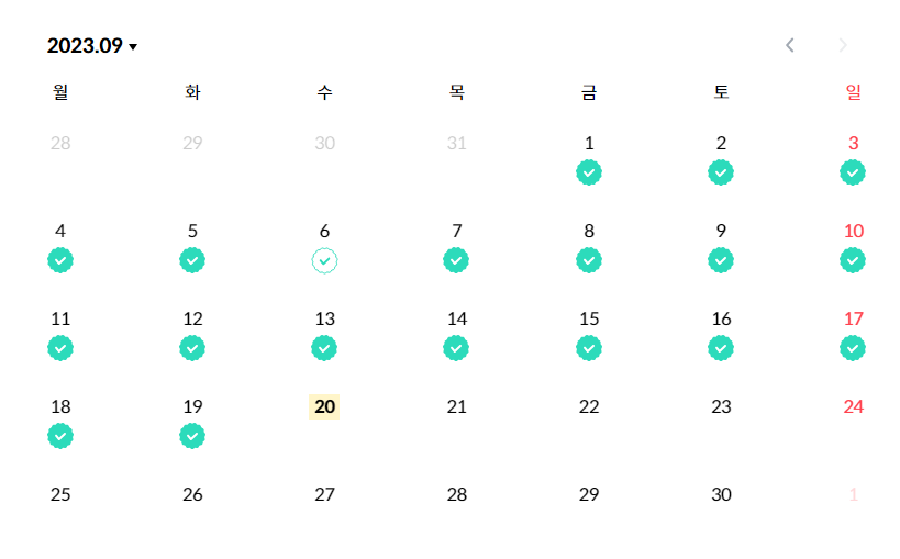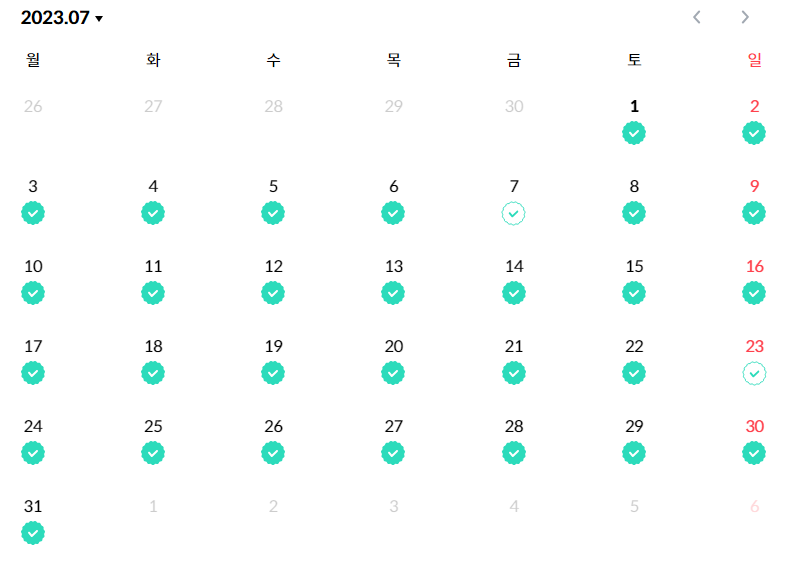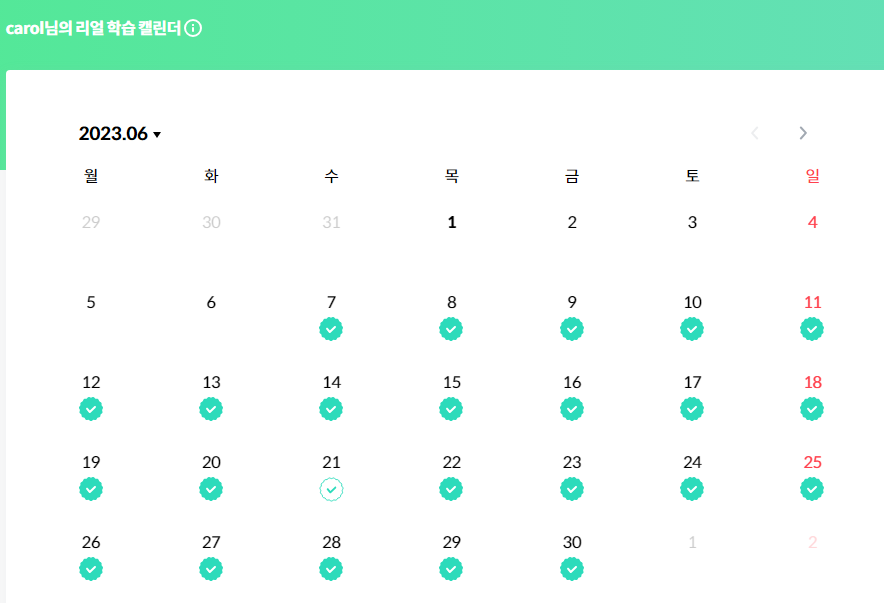 리얼클래스에는 '학습 캘린더'라는게 있는데 데일리 클래스를 완료하면 초록색으로 체크가 된다.